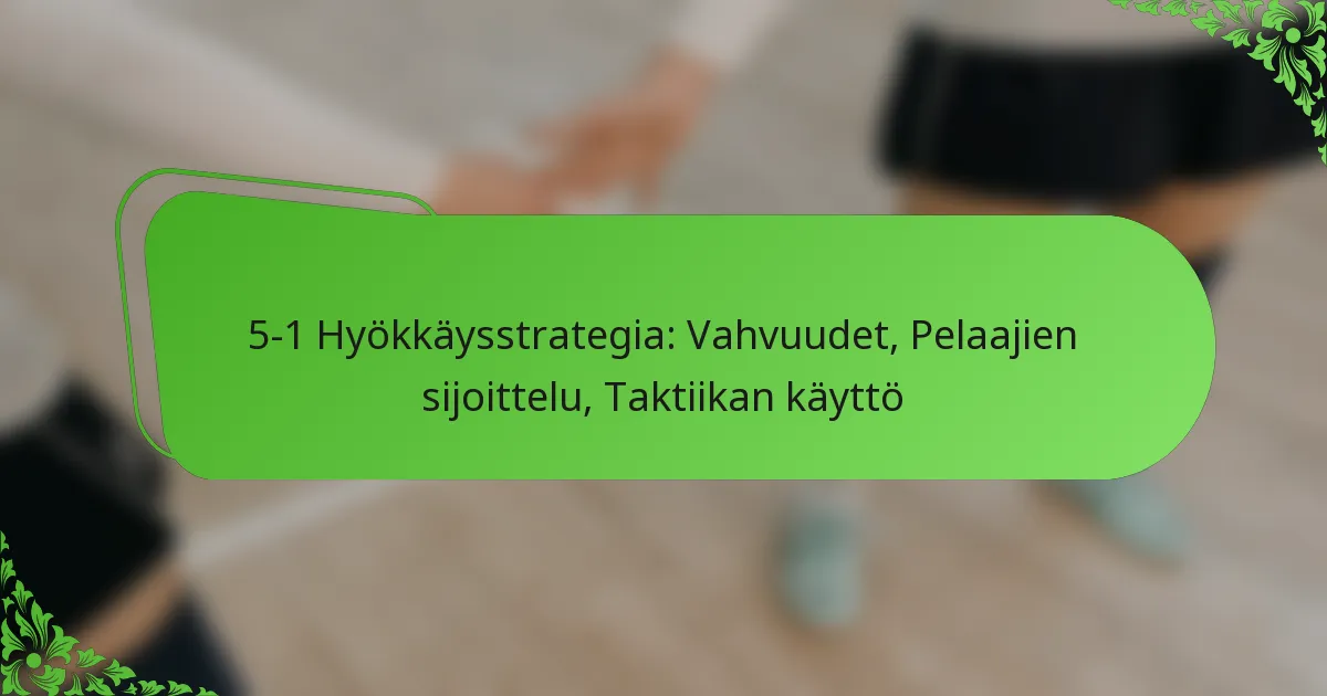 5-1-hyökkäysstrategia on taktinen muodostelma, jossa on viisi hyökkääjää ja yksi nimetty pelinrakentaja, kuten passari tai pelinjohtaja. Tämä asettelu ei ainoastaan paranna maalintekomahdollisuuksia, vaan myös edistää tehokasta viestintää ja liikettä pelaajien keskuudessa, mikä mahdollistaa joukkueiden puolustuksellisten heikkouksien hyödyntämisen ja tasapainoisen lähestymistavan ylläpitämisen sekä hyökkäyksessä että puolustuksessa.